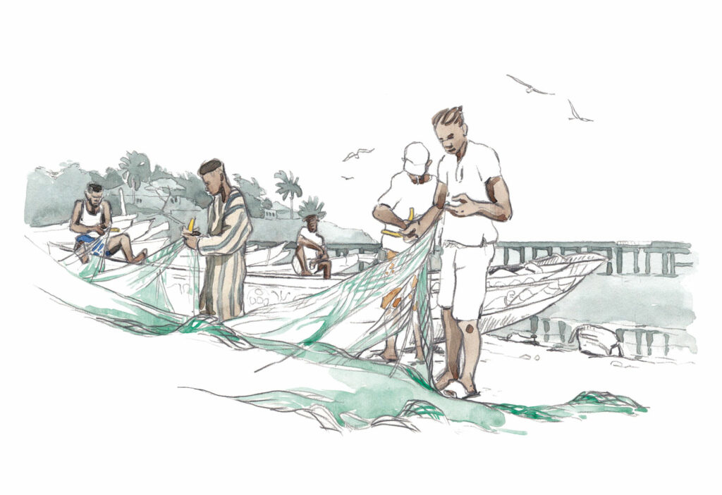 Au sein de la communauté de pêcheurs de Bakau et au plus près de ses habitants, Daniel Mielniczek a réalisé une série de photographies documentant les réalités du quotidien. À travers mes dessins à l’aquarelle et au brou de noix, j’ai de mon côté cherché à restituer la richesse des milieux populaires, à capter l’effervescence ambiante. Nous avons tous deux été saisis et touchés par l’importance de la communauté et des liens qui se tissent par delà les difficultés matérielles. Venez partager avec nous cette découverte d’un petit bout d’Afrique où le mot fraternité a encore un sens.