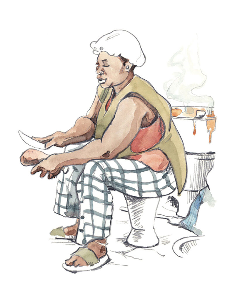 Tous les espaces de la ville sont investis. Les gens vivent dans la rue : ils y discutent, mangent et travaillent à l’ombre d’arbres protecteurs ou de gigantesques panneaux publicitaires. Sur les affiches on vante le monde moderne : la 5G et les nouvelles technologies, mais derrière la réclame, dans la poussière rouge qui recouvre ici toute chose, assis sur un vieux pneu, on fait toujours griller du maïs ou des cacahouètes sur les braseros.