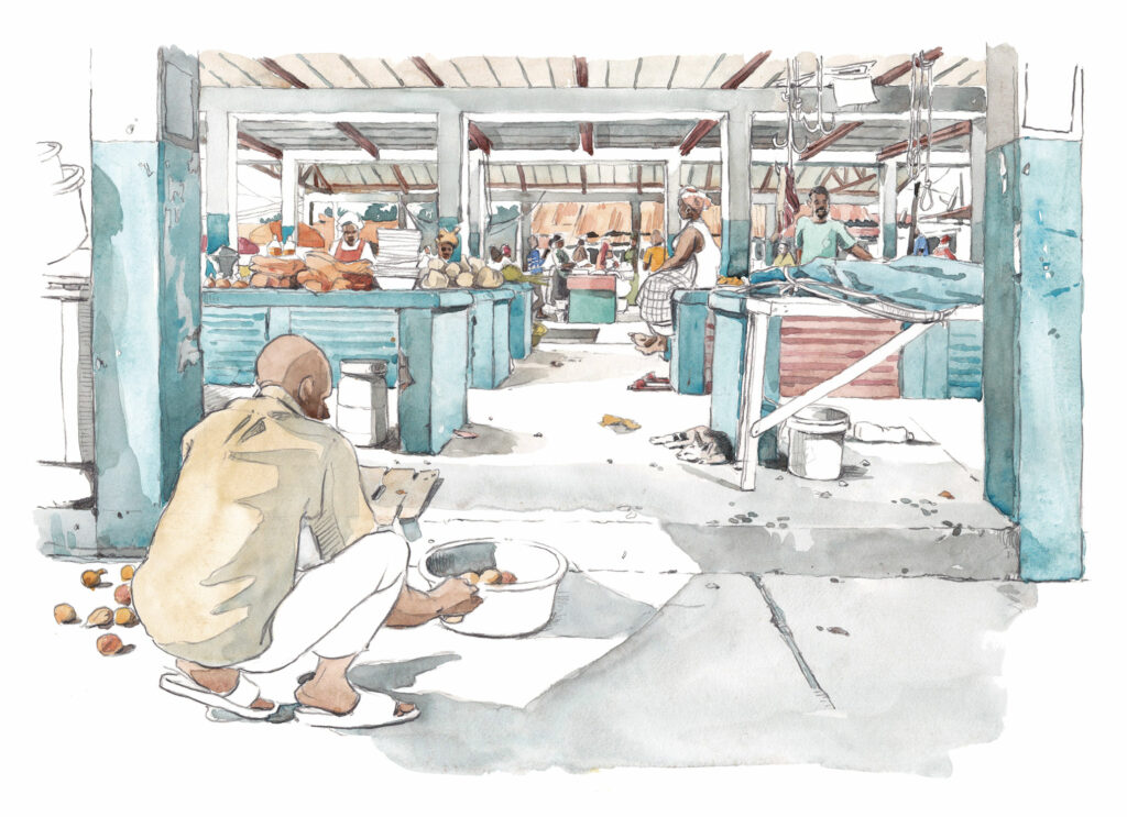 Tout comme les hommes, les animaux occupent les lieux: chats, chiens, poules, chèvres et moutons déambulent librement, les vautours ont investi le terrain de foot voisin et lorsqu’un bœuf aux grandes cornes décide de traverser le rond point, il s’insère dans la circulation, entre un pick-up et une charrette poussée par deux ânes, sans que personne ne s’en inquiète.